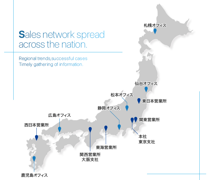 現在、北は札幌から南は鹿児島まで主要都市に営業所を設置し、全国規模で営業を展開しています。地域特性や、全国営業所での成功事例を踏まえつつ、広告・販促物の企画提案から制作物の作成までワンストップで対応しています。どの地域においても他の追随を許さないクオリティとスピードで、ベストなサービスを提供しています。