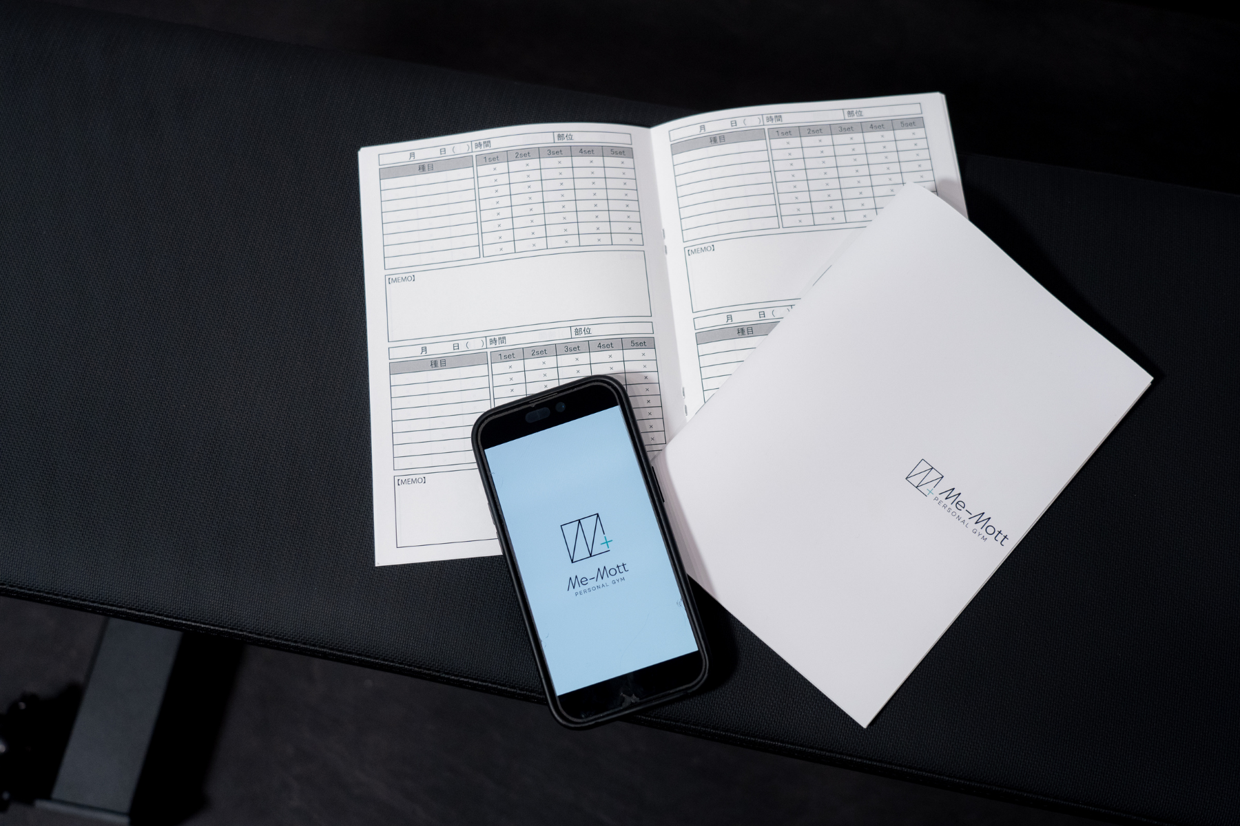 オリジナルのノートやアプリを使用して、トレーニングや食事の内容を記録。トレーナーと情報を共有し、週単位で細やかなアドバイスが受けられるだけでなく、自分で記録を見返すことによって経験が知識として吸収され、卒業後のボディメイクの習慣化にも役立てられるようになっています。