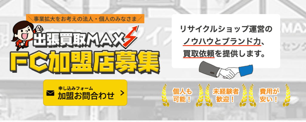 出張買取MAXは、日本全国でフランチャイズ加盟店を募集する無店舗型のリサイクルショップ買取サービスです。ロイヤリティ0円、独自の成果報酬型モデルで、在庫や販路の不安を本部がサポートします。初心者でも研修・サポートが充実し、低コスト開業が可能。既存事業者の追加収益源としても、独立開業者にも最適なビジネスプランを提供します。