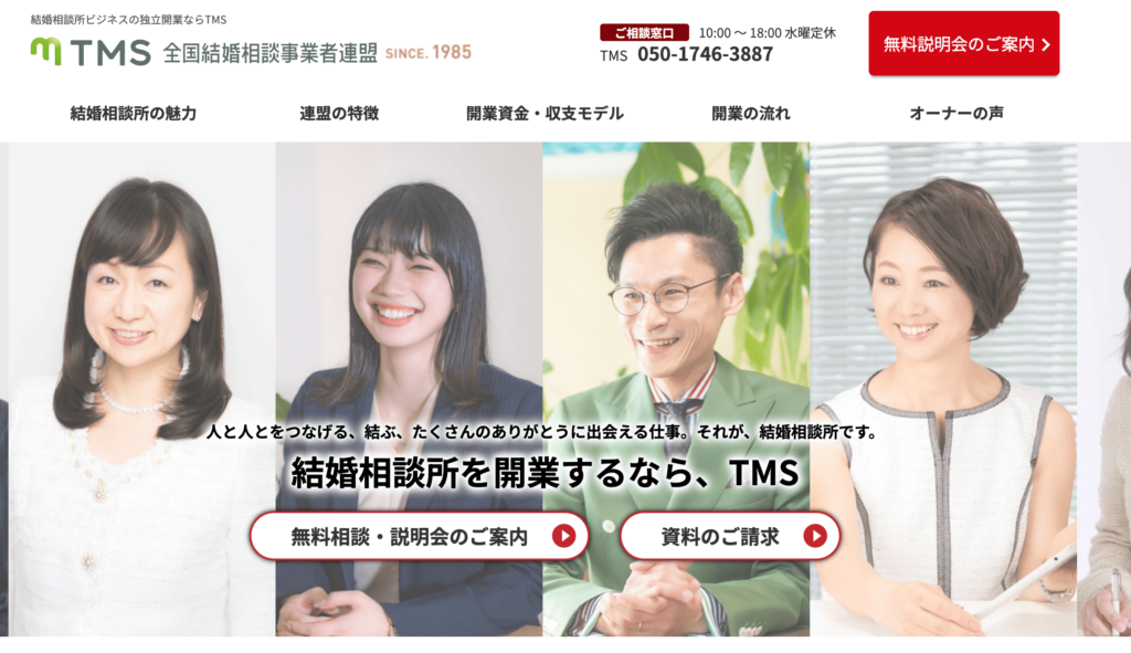 全国結婚相談事業者連盟(TMS)は、35年以上の歴史を持つ結婚相談所連盟で、2023年11月時点で全国に約1,936の加盟相談所と約87,460名の会員が在籍しています。加盟金は82.5万円(税込)で、ロイヤリティは不要です。
