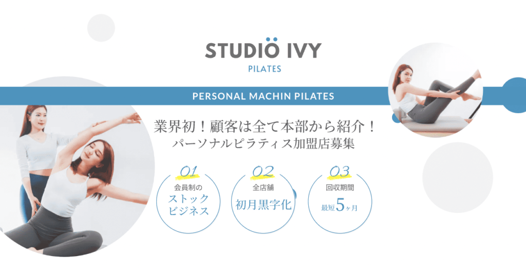 STUDIO IVYは、マンションの一室で簡単に開業できるパーソナルマシンピラティススタジオです。初期費用100万円から開業可能で、ピラティス未経験者や経営初心者でも、本部の集客・広告運用・研修制度の手厚いサポートがあるため安心です。契約者の多くが月額制プランを選択し、安定した売上が見込めるため、最短5ヶ月で投資回収が可能。1次募集中の今がチャンスです。
