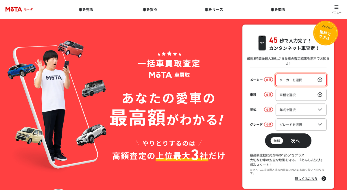 「MOTA」は、最大20社がWEB上で査定額を提示し、その中から 高額査定の上位3社のみ とやり取りできる一括査定サービスです。一般的な一括査定のような大量の営業電話がなく、負担を最小限にしながら高価買取が狙える仕組みが特徴です。