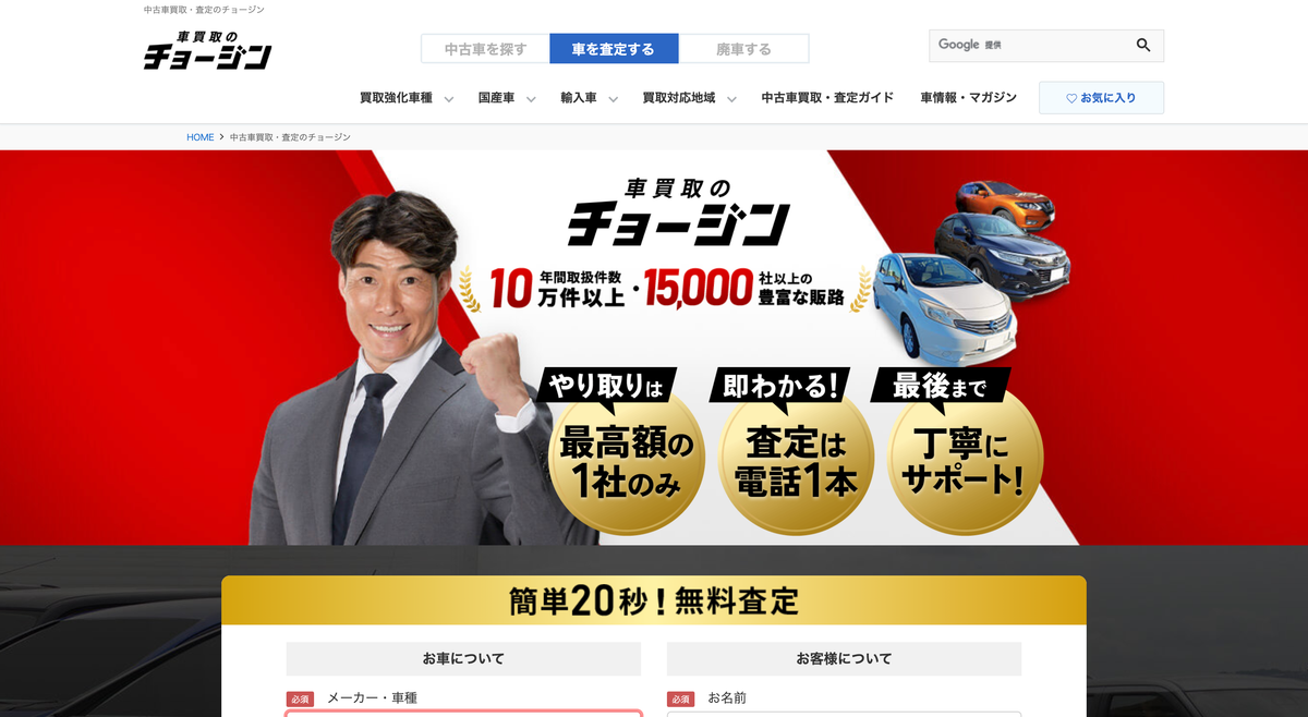 「チョージン」は、車を高く売りたいけれど、複数業者とのやり取りや営業電話が煩わしいと感じている方に向いているサービスです。おすすめされた1社とだけやり取りする仕組みのため、スムーズな売却が可能です。