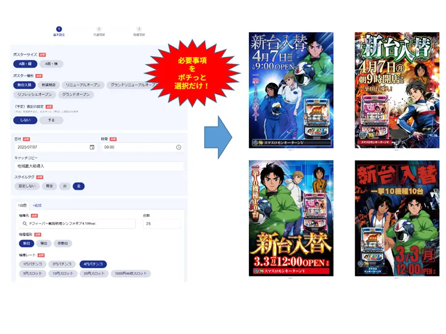POP-AIは、新台入替ポスターや出玉ランキング、フロアマップ生成など多様な場面で活用可能です。従来は時間と人手が必要だった制作業務を効率化し、即時性のある販促展開を実現。日常的な告知から大型キャンペーンまで幅広く対応し、ホール運営の集客力を強化します。